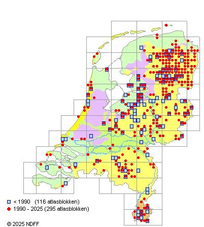 Het aantal atlasblokken (5x5 km) waarin de soort is gemeld binnen een periode van vijf jaar (vanaf 1980) of twintig jaar. Niet gecorrigeerd voor waarnemersinspanning en het aantal doorgegeven waarnemingen kan sterk variëren per periode, dus een trend in verspreiding kan hier niet direct uit worden afgelezen. Het opgegeven jaartal is het eerste jaar van de periode. Bron: gevalideerde waarnemingen uit de NDFF.