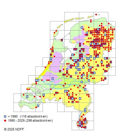 Het aantal atlasblokken (5x5 km) waarin de soort is gemeld binnen een periode van vijf jaar (vanaf 1980) of twintig jaar. Niet gecorrigeerd voor waarnemersinspanning en het aantal doorgegeven waarnemingen kan sterk variëren per periode, dus een trend in verspreiding kan hier niet direct uit worden afgelezen. Het opgegeven jaartal is het eerste jaar van de periode. Bron: gevalideerde waarnemingen uit de NDFF.
