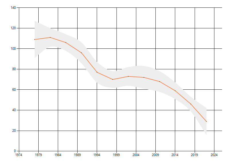 Gemiddelde trend van het aantal kilometerhokken waarin de soort voorkomt, weergegeven als indexcijfer (1975-1978 = 100).
