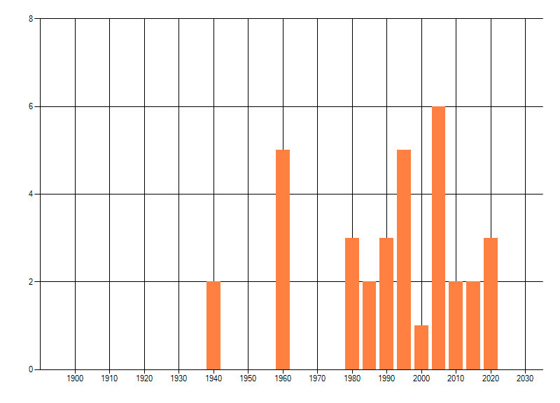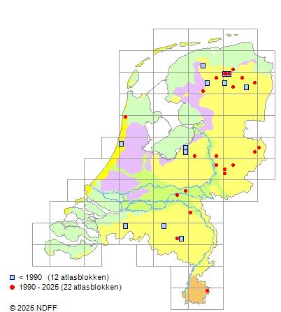 Het aantal atlasblokken (5x5 km) waarin de soort is gemeld binnen een periode van vijf jaar (vanaf 1980) of twintig jaar. Niet gecorrigeerd voor waarnemersinspanning en het aantal doorgegeven waarnemingen kan sterk variëren per periode, dus een trend in verspreiding kan hier niet direct uit worden afgelezen. Het opgegeven jaartal is het eerste jaar van de periode. Bron: gevalideerde waarnemingen uit de NDFF.