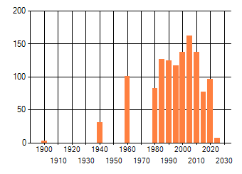 Het aantal atlasblokken (5x5 km) waarin de soort is gemeld binnen een periode van vijf jaar (vanaf 1980) of twintig jaar. Niet gecorrigeerd voor waarnemersinspanning en het aantal doorgegeven waarnemingen kan sterk variëren per periode, dus een trend in verspreiding kan hier niet direct uit worden afgelezen. Het opgegeven jaartal is het eerste jaar van de periode. Bron: gevalideerde waarnemingen uit de NDFF.