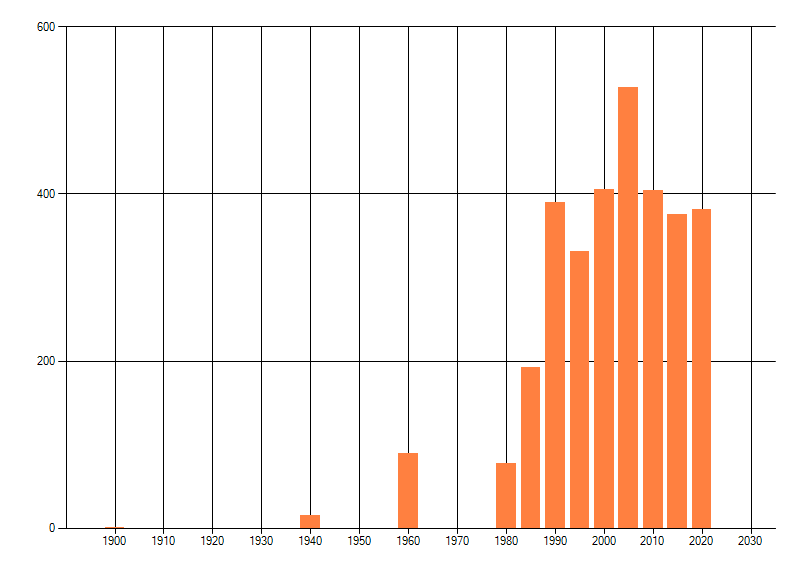 Het aantal atlasblokken (5x5 km) waarin de soort is gemeld binnen een periode van vijf jaar (vanaf 1980) of twintig jaar. Niet gecorrigeerd voor waarnemersinspanning en het aantal doorgegeven waarnemingen kan sterk variëren per periode, dus een trend in verspreiding kan hier niet direct uit worden afgelezen. Het opgegeven jaartal is het eerste jaar van de periode. Bron: gevalideerde waarnemingen uit de NDFF.