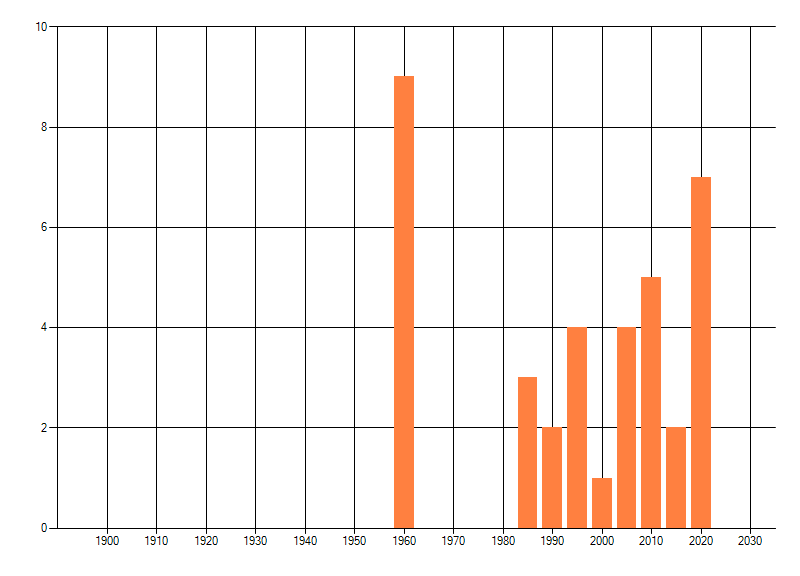 Het aantal atlasblokken (5x5 km) waarin de soort is gemeld binnen een periode van vijf jaar (vanaf 1980) of twintig jaar. Niet gecorrigeerd voor waarnemersinspanning en het aantal doorgegeven waarnemingen kan sterk variëren per periode, dus een trend in verspreiding kan hier niet direct uit worden afgelezen. Het opgegeven jaartal is het eerste jaar van de periode. Bron: gevalideerde waarnemingen uit de NDFF.