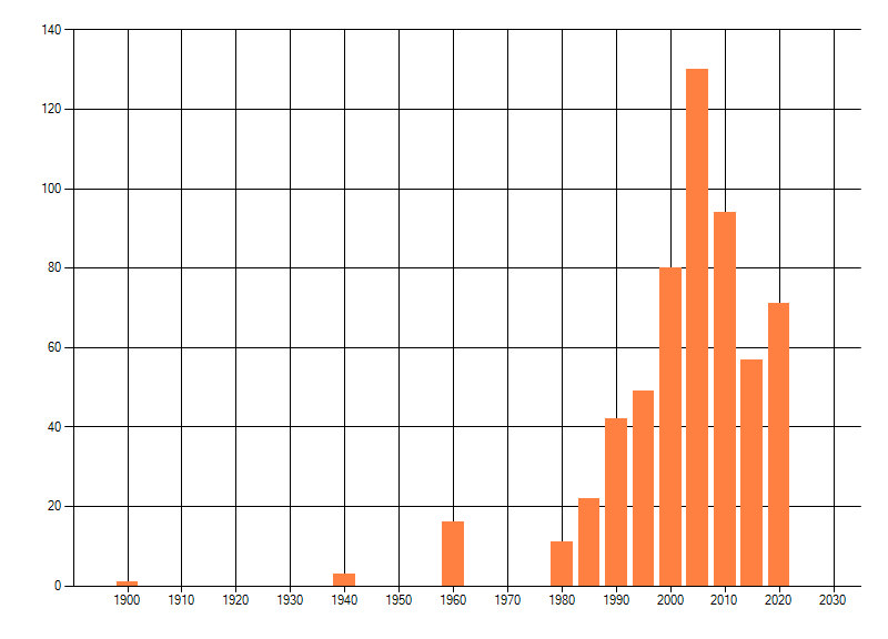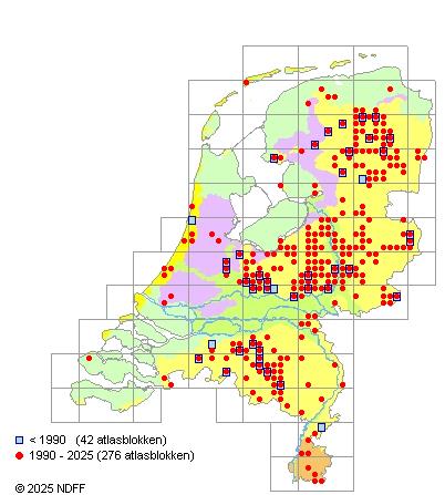 Het aantal atlasblokken (5x5 km) waarin de soort is gemeld binnen een periode van vijf jaar (vanaf 1980) of twintig jaar. Niet gecorrigeerd voor waarnemersinspanning en het aantal doorgegeven waarnemingen kan sterk variëren per periode, dus een trend in verspreiding kan hier niet direct uit worden afgelezen. Het opgegeven jaartal is het eerste jaar van de periode. Bron: gevalideerde waarnemingen uit de NDFF.
