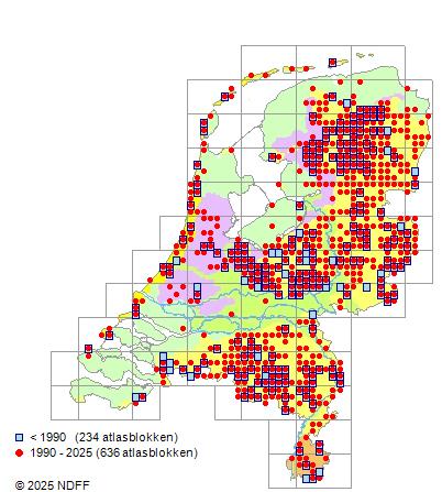 Het aantal atlasblokken (5x5 km) waarin de soort is gemeld binnen een periode van vijf jaar (vanaf 1980) of twintig jaar. Niet gecorrigeerd voor waarnemersinspanning en het aantal doorgegeven waarnemingen kan sterk variëren per periode, dus een trend in verspreiding kan hier niet direct uit worden afgelezen. Het opgegeven jaartal is het eerste jaar van de periode. Bron: gevalideerde waarnemingen uit de NDFF.