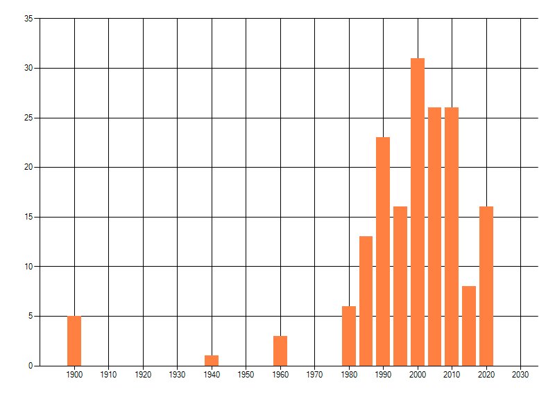 Het aantal atlasblokken (5x5 km) waarin de soort is gemeld binnen een periode van vijf jaar (vanaf 1980) of twintig jaar. Niet gecorrigeerd voor waarnemersinspanning en het aantal doorgegeven waarnemingen kan sterk variëren per periode, dus een trend in verspreiding kan hier niet direct uit worden afgelezen. Het opgegeven jaartal is het eerste jaar van de periode. Bron: gevalideerde waarnemingen uit de NDFF.