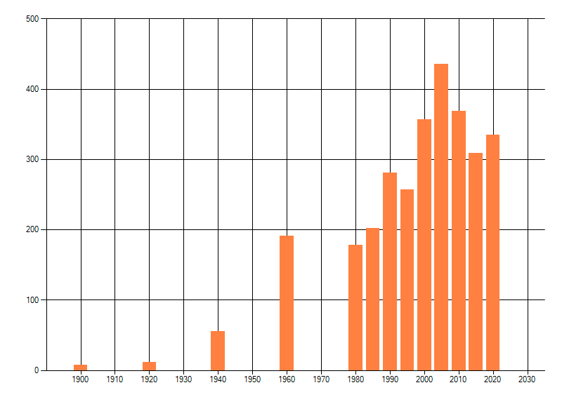 Het aantal atlasblokken (5x5 km) waarin de soort is gemeld binnen een periode van vijf jaar (vanaf 1980) of twintig jaar. Niet gecorrigeerd voor waarnemersinspanning en het aantal doorgegeven waarnemingen kan sterk variëren per periode, dus een trend in verspreiding kan hier niet direct uit worden afgelezen. Het opgegeven jaartal is het eerste jaar van de periode. Bron: gevalideerde waarnemingen uit de NDFF.