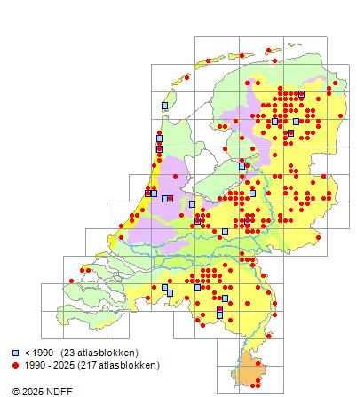 Het aantal atlasblokken (5x5 km) waarin de soort is gemeld binnen een periode van vijf jaar (vanaf 1980) of twintig jaar. Niet gecorrigeerd voor waarnemersinspanning en het aantal doorgegeven waarnemingen kan sterk variëren per periode, dus een trend in verspreiding kan hier niet direct uit worden afgelezen. Het opgegeven jaartal is het eerste jaar van de periode. Bron: gevalideerde waarnemingen uit de NDFF.