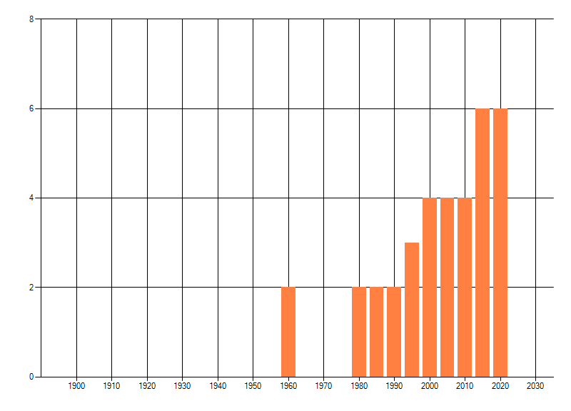 Het aantal atlasblokken (5x5 km) waarin de soort is gemeld binnen een periode van vijf jaar (vanaf 1980) of twintig jaar. Niet gecorrigeerd voor waarnemersinspanning en het aantal doorgegeven waarnemingen kan sterk variëren per periode, dus een trend in verspreiding kan hier niet direct uit worden afgelezen. Het opgegeven jaartal is het eerste jaar van de periode. Bron: gevalideerde waarnemingen uit de NDFF.