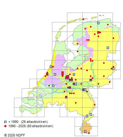 Volgens bestand NMV vrij zeld., thans zeld.; matig alg. in F, zeer zeld. in K, Z, S, L, N en D.