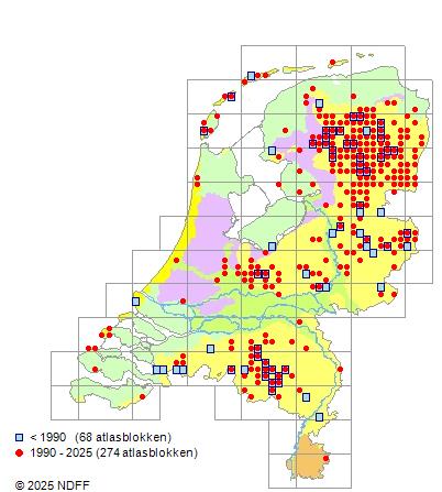 Het aantal atlasblokken (5x5 km) waarin de soort is gemeld binnen een periode van vijf jaar (vanaf 1980) of twintig jaar. Niet gecorrigeerd voor waarnemersinspanning en het aantal doorgegeven waarnemingen kan sterk variëren per periode, dus een trend in verspreiding kan hier niet direct uit worden afgelezen. Het opgegeven jaartal is het eerste jaar van de periode. Bron: gevalideerde waarnemingen uit de NDFF.
