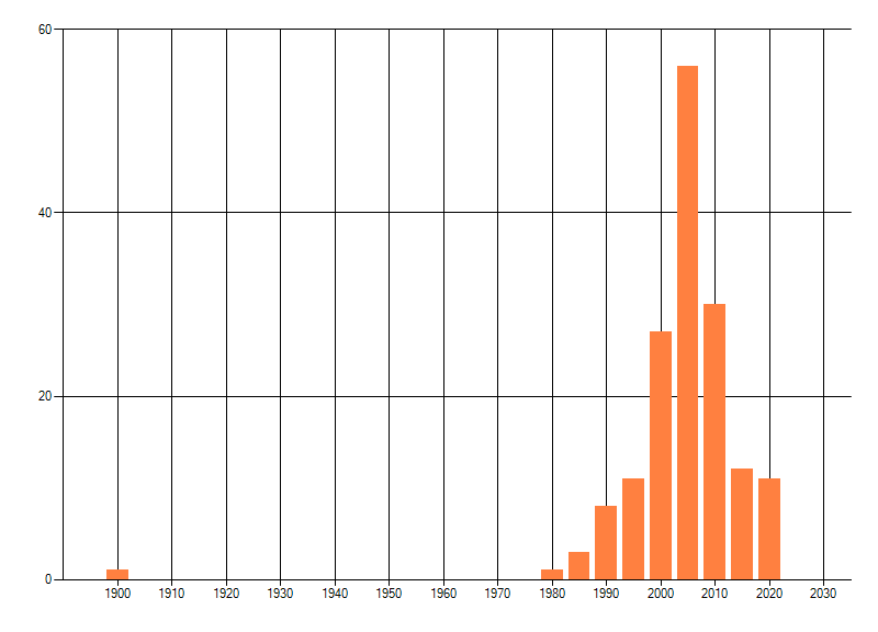 Het aantal atlasblokken (5x5 km) waarin de soort is gemeld binnen een periode van vijf jaar (vanaf 1980) of twintig jaar. Niet gecorrigeerd voor waarnemersinspanning en het aantal doorgegeven waarnemingen kan sterk variëren per periode, dus een trend in verspreiding kan hier niet direct uit worden afgelezen. Het opgegeven jaartal is het eerste jaar van de periode. Bron: gevalideerde waarnemingen uit de NDFF.