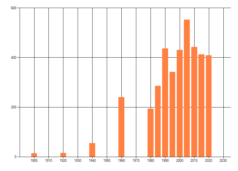 Het aantal atlasblokken (5x5 km) waarin de soort is gemeld binnen een periode van vijf jaar (vanaf 1980) of twintig jaar. Niet gecorrigeerd voor waarnemersinspanning en het aantal doorgegeven waarnemingen kan sterk variëren per periode, dus een trend in verspreiding kan hier niet direct uit worden afgelezen. Het opgegeven jaartal is het eerste jaar van de periode. Bron: gevalideerde waarnemingen uit de NDFF.
