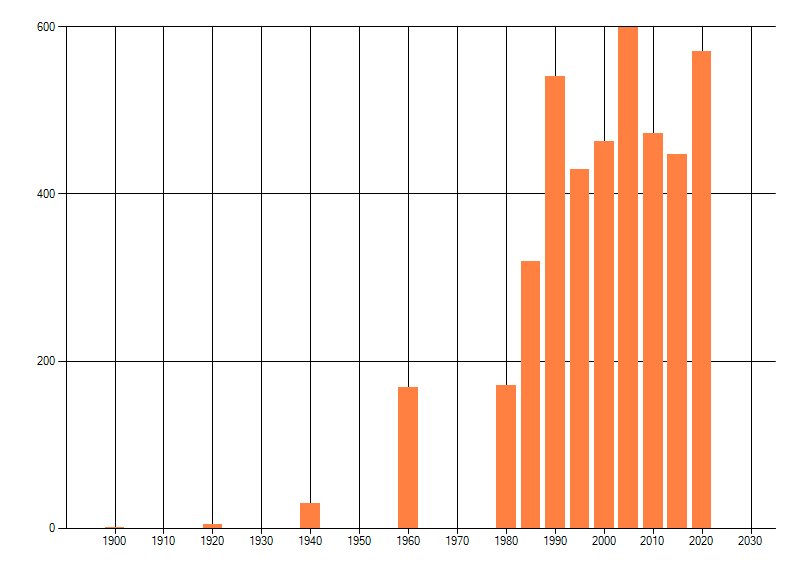 Het aantal atlasblokken (5x5 km) waarin de soort is gemeld binnen een periode van vijf jaar (vanaf 1980) of twintig jaar. Niet gecorrigeerd voor waarnemersinspanning en het aantal doorgegeven waarnemingen kan sterk variëren per periode, dus een trend in verspreiding kan hier niet direct uit worden afgelezen. Het opgegeven jaartal is het eerste jaar van de periode. Bron: gevalideerde waarnemingen uit de NDFF.