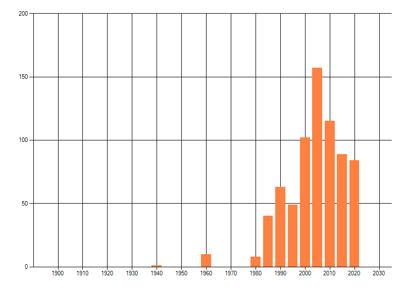 Het aantal atlasblokken (5x5 km) waarin de soort is gemeld binnen een periode van vijf jaar (vanaf 1980) of twintig jaar. Niet gecorrigeerd voor waarnemersinspanning en het aantal doorgegeven waarnemingen kan sterk variëren per periode, dus een trend in verspreiding kan hier niet direct uit worden afgelezen. Het opgegeven jaartal is het eerste jaar van de periode. Bron: gevalideerde waarnemingen uit de NDFF.