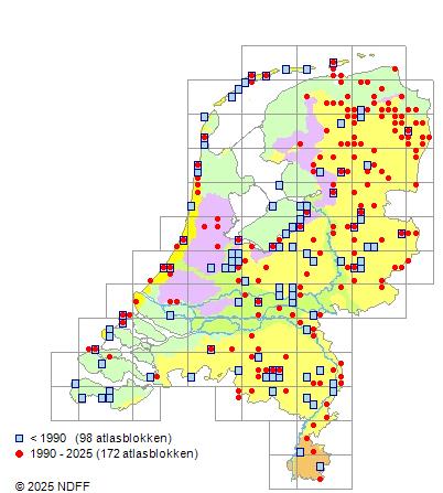 Het aantal atlasblokken (5x5 km) waarin de soort is gemeld binnen een periode van vijf jaar (vanaf 1980) of twintig jaar. Niet gecorrigeerd voor waarnemersinspanning en het aantal doorgegeven waarnemingen kan sterk variëren per periode, dus een trend in verspreiding kan hier niet direct uit worden afgelezen. Het opgegeven jaartal is het eerste jaar van de periode. Bron: gevalideerde waarnemingen uit de NDFF.