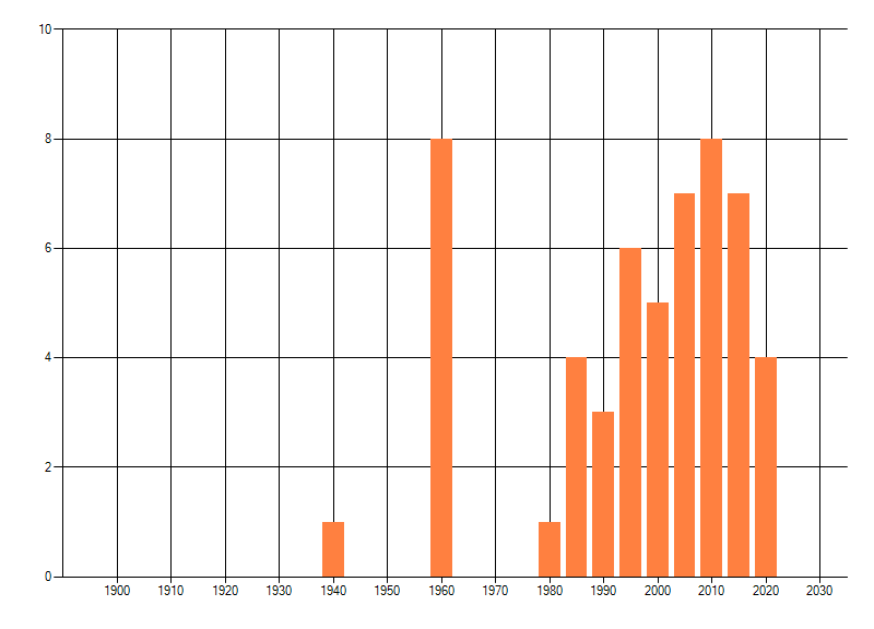 Het aantal atlasblokken (5x5 km) waarin de soort is gemeld binnen een periode van vijf jaar (vanaf 1980) of twintig jaar. Niet gecorrigeerd voor waarnemersinspanning en het aantal doorgegeven waarnemingen kan sterk variëren per periode, dus een trend in verspreiding kan hier niet direct uit worden afgelezen. Het opgegeven jaartal is het eerste jaar van de periode. Bron: gevalideerde waarnemingen uit de NDFF.