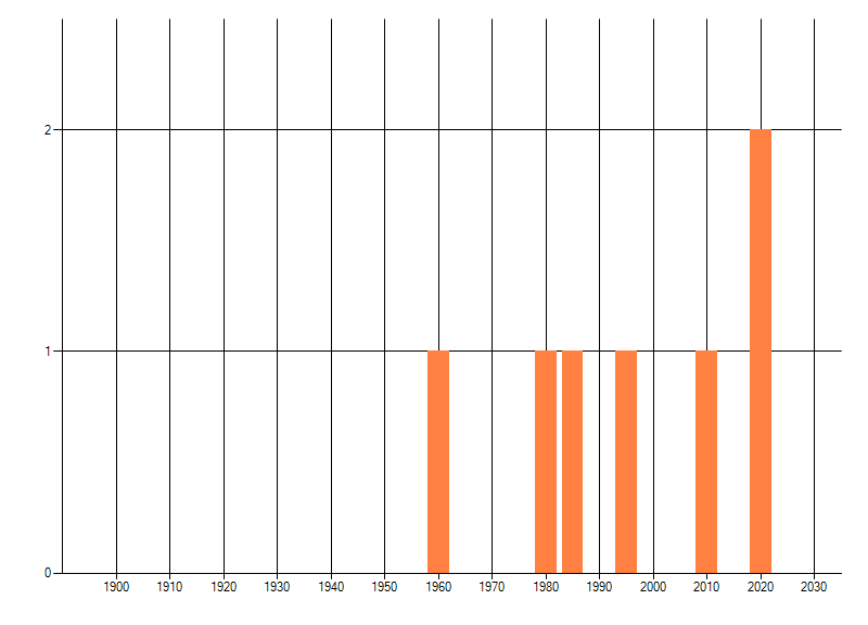 Het aantal atlasblokken (5x5 km) waarin de soort is gemeld binnen een periode van vijf jaar (vanaf 1980) of twintig jaar. Niet gecorrigeerd voor waarnemersinspanning en het aantal doorgegeven waarnemingen kan sterk variëren per periode, dus een trend in verspreiding kan hier niet direct uit worden afgelezen. Het opgegeven jaartal is het eerste jaar van de periode. Bron: gevalideerde waarnemingen uit de NDFF.