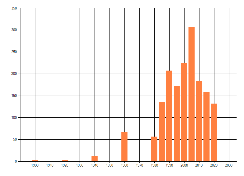 Het aantal atlasblokken (5x5 km) waarin de soort is gemeld binnen een periode van vijf jaar (vanaf 1980) of twintig jaar. Niet gecorrigeerd voor waarnemersinspanning en het aantal doorgegeven waarnemingen kan sterk variëren per periode, dus een trend in verspreiding kan hier niet direct uit worden afgelezen. Het opgegeven jaartal is het eerste jaar van de periode. Bron: gevalideerde waarnemingen uit de NDFF.