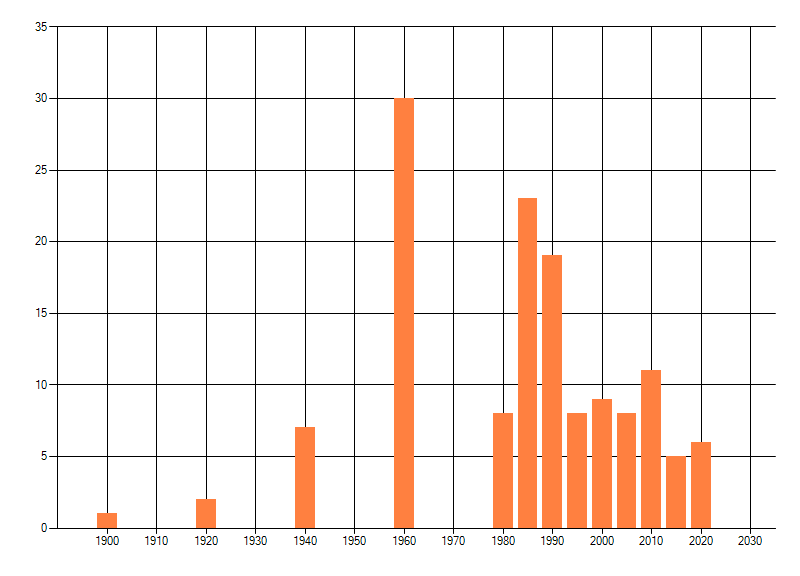 Het aantal atlasblokken (5x5 km) waarin de soort is gemeld binnen een periode van vijf jaar (vanaf 1980) of twintig jaar. Niet gecorrigeerd voor waarnemersinspanning en het aantal doorgegeven waarnemingen kan sterk variëren per periode, dus een trend in verspreiding kan hier niet direct uit worden afgelezen. Het opgegeven jaartal is het eerste jaar van de periode. Bron: gevalideerde waarnemingen uit de NDFF.
