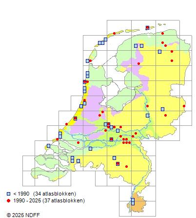 Het aantal atlasblokken (5x5 km) waarin de soort is gemeld binnen een periode van vijf jaar (vanaf 1980) of twintig jaar. Niet gecorrigeerd voor waarnemersinspanning en het aantal doorgegeven waarnemingen kan sterk variëren per periode, dus een trend in verspreiding kan hier niet direct uit worden afgelezen. Het opgegeven jaartal is het eerste jaar van de periode. Bron: gevalideerde waarnemingen uit de NDFF.