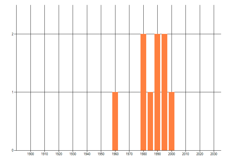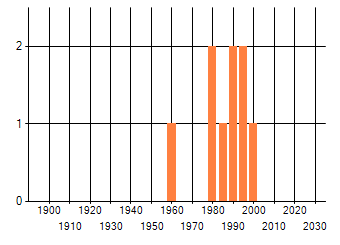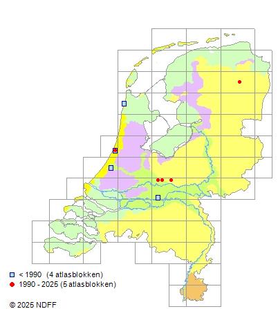 Het aantal atlasblokken (5x5 km) waarin de soort is gemeld binnen een periode van vijf jaar (vanaf 1980) of twintig jaar. Niet gecorrigeerd voor waarnemersinspanning en het aantal doorgegeven waarnemingen kan sterk variëren per periode, dus een trend in verspreiding kan hier niet direct uit worden afgelezen. Het opgegeven jaartal is het eerste jaar van de periode. Bron: gevalideerde waarnemingen uit de NDFF.