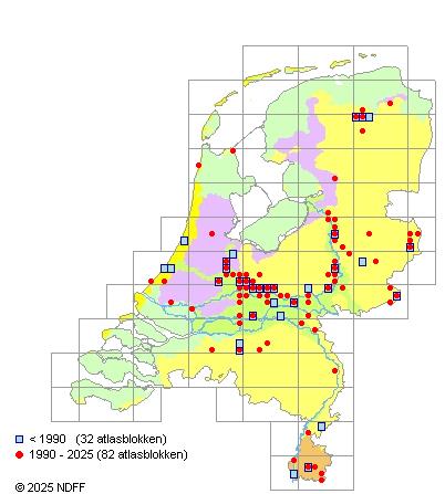 Het aantal atlasblokken (5x5 km) waarin de soort is gemeld binnen een periode van vijf jaar (vanaf 1980) of twintig jaar. Niet gecorrigeerd voor waarnemersinspanning en het aantal doorgegeven waarnemingen kan sterk variëren per periode, dus een trend in verspreiding kan hier niet direct uit worden afgelezen. Het opgegeven jaartal is het eerste jaar van de periode. Bron: gevalideerde waarnemingen uit de NDFF.