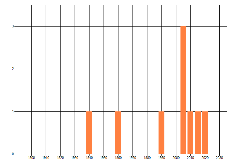 Het aantal atlasblokken (5x5 km) waarin de soort is gemeld binnen een periode van vijf jaar (vanaf 1980) of twintig jaar. Niet gecorrigeerd voor waarnemersinspanning en het aantal doorgegeven waarnemingen kan sterk variëren per periode, dus een trend in verspreiding kan hier niet direct uit worden afgelezen. Het opgegeven jaartal is het eerste jaar van de periode. Bron: gevalideerde waarnemingen uit de NDFF.