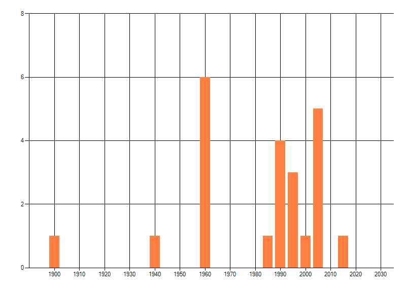 Het aantal atlasblokken (5x5 km) waarin de soort is gemeld binnen een periode van vijf jaar (vanaf 1980) of twintig jaar. Niet gecorrigeerd voor waarnemersinspanning en het aantal doorgegeven waarnemingen kan sterk variëren per periode, dus een trend in verspreiding kan hier niet direct uit worden afgelezen. Het opgegeven jaartal is het eerste jaar van de periode. Bron: gevalideerde waarnemingen uit de NDFF.