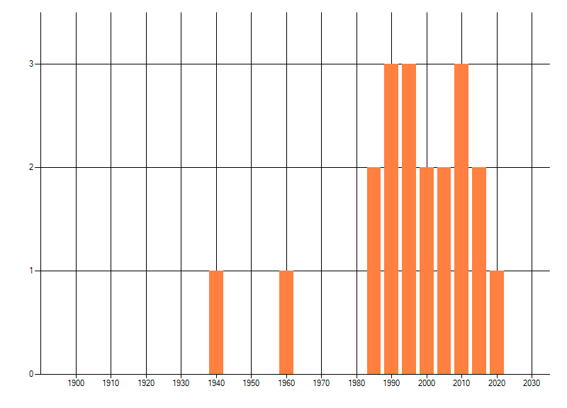 Het aantal atlasblokken (5x5 km) waarin de soort is gemeld binnen een periode van vijf jaar (vanaf 1980) of twintig jaar. Niet gecorrigeerd voor waarnemersinspanning en het aantal doorgegeven waarnemingen kan sterk variëren per periode, dus een trend in verspreiding kan hier niet direct uit worden afgelezen. Het opgegeven jaartal is het eerste jaar van de periode. Bron: gevalideerde waarnemingen uit de NDFF.