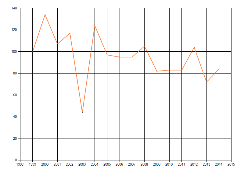 Trend in het geschatte aantal individuen van paddenstoelen in bossen op de hoge zandgronden, weergegeven als indexcijfer (eerste jaar = 100). Bron:
