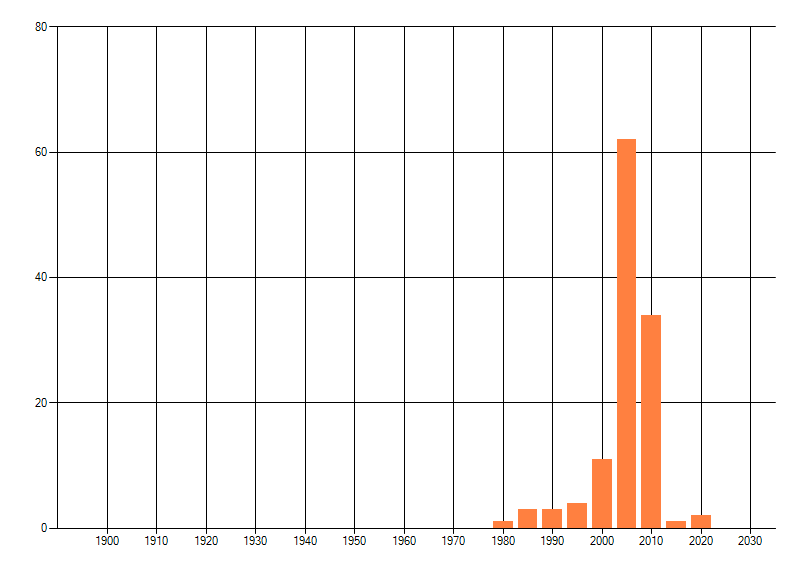 Het aantal atlasblokken (5x5 km) waarin de soort is gemeld binnen een periode van vijf jaar (vanaf 1980) of twintig jaar. Niet gecorrigeerd voor waarnemersinspanning en het aantal doorgegeven waarnemingen kan sterk variëren per periode, dus een trend in verspreiding kan hier niet direct uit worden afgelezen. Het opgegeven jaartal is het eerste jaar van de periode. Bron: gevalideerde waarnemingen uit de NDFF.