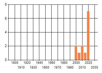 Het aantal atlasblokken (5x5 km) waarin de soort is gemeld binnen een periode van vijf jaar (vanaf 1980) of twintig jaar. Niet gecorrigeerd voor waarnemersinspanning en het aantal doorgegeven waarnemingen kan sterk variëren per periode, dus een trend in verspreiding kan hier niet direct uit worden afgelezen. Het opgegeven jaartal is het eerste jaar van de periode. Bron: gevalideerde waarnemingen uit de NDFF.