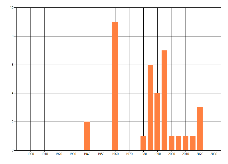 Het aantal atlasblokken (5x5 km) waarin de soort is gemeld binnen een periode van vijf jaar (vanaf 1980) of twintig jaar. Niet gecorrigeerd voor waarnemersinspanning en het aantal doorgegeven waarnemingen kan sterk variëren per periode, dus een trend in verspreiding kan hier niet direct uit worden afgelezen. Het opgegeven jaartal is het eerste jaar van de periode. Bron: gevalideerde waarnemingen uit de NDFF.