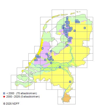 Het aantal atlasblokken (5x5 km) waarin de soort is gemeld binnen een periode van vijf jaar (vanaf 1980) of twintig jaar. Niet gecorrigeerd voor waarnemersinspanning en het aantal doorgegeven waarnemingen kan sterk variëren per periode, dus een trend in verspreiding kan hier niet direct uit worden afgelezen. Het opgegeven jaartal is het eerste jaar van de periode. Bron: gevalideerde waarnemingen uit de NDFF.