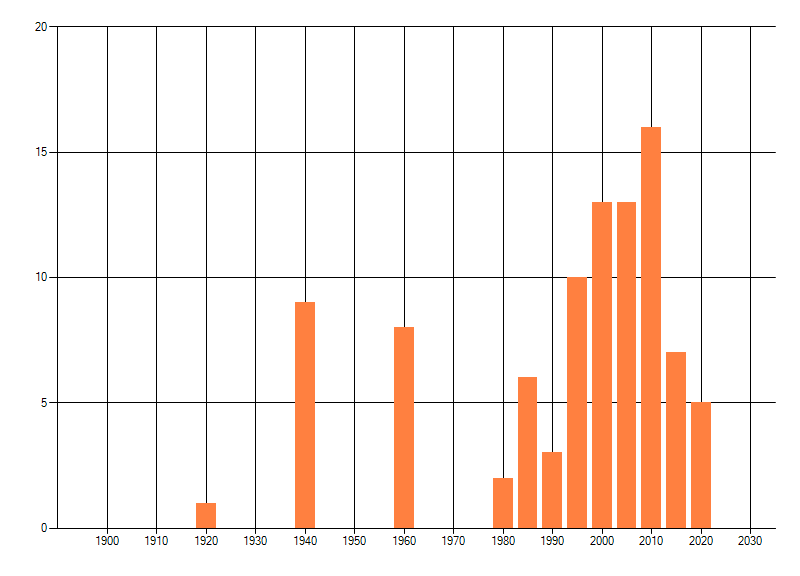 Het aantal atlasblokken (5x5 km) waarin de soort is gemeld binnen een periode van vijf jaar (vanaf 1980) of twintig jaar. Niet gecorrigeerd voor waarnemersinspanning en het aantal doorgegeven waarnemingen kan sterk variëren per periode, dus een trend in verspreiding kan hier niet direct uit worden afgelezen. Het opgegeven jaartal is het eerste jaar van de periode. Bron: gevalideerde waarnemingen uit de NDFF.
