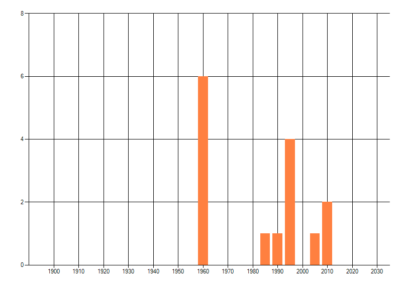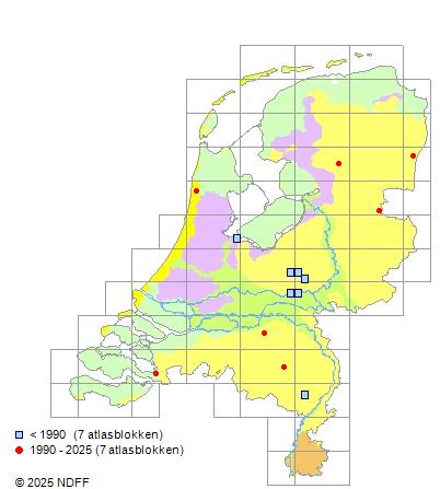 Het aantal atlasblokken (5x5 km) waarin de soort is gemeld binnen een periode van vijf jaar (vanaf 1980) of twintig jaar. Niet gecorrigeerd voor waarnemersinspanning en het aantal doorgegeven waarnemingen kan sterk variëren per periode, dus een trend in verspreiding kan hier niet direct uit worden afgelezen. Het opgegeven jaartal is het eerste jaar van de periode. Bron: gevalideerde waarnemingen uit de NDFF.