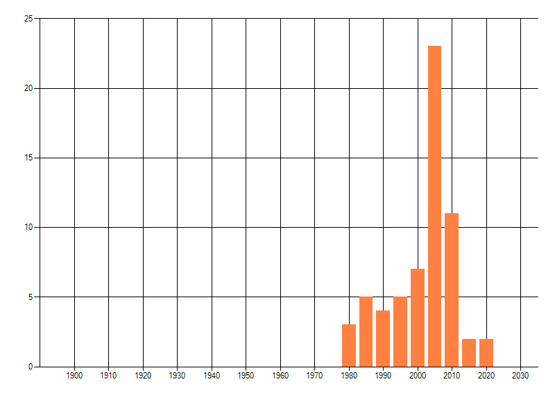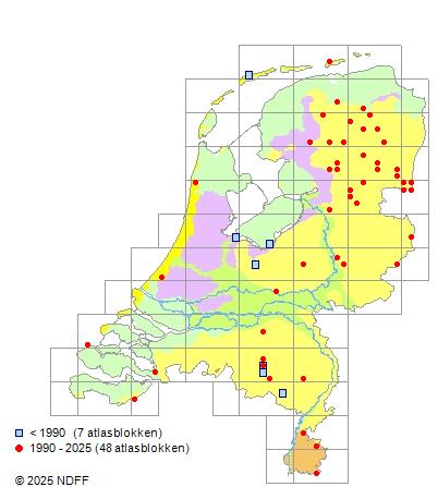 Het aantal atlasblokken (5x5 km) waarin de soort is gemeld binnen een periode van vijf jaar (vanaf 1980) of twintig jaar. Niet gecorrigeerd voor waarnemersinspanning en het aantal doorgegeven waarnemingen kan sterk variëren per periode, dus een trend in verspreiding kan hier niet direct uit worden afgelezen. Het opgegeven jaartal is het eerste jaar van de periode. Bron: gevalideerde waarnemingen uit de NDFF.