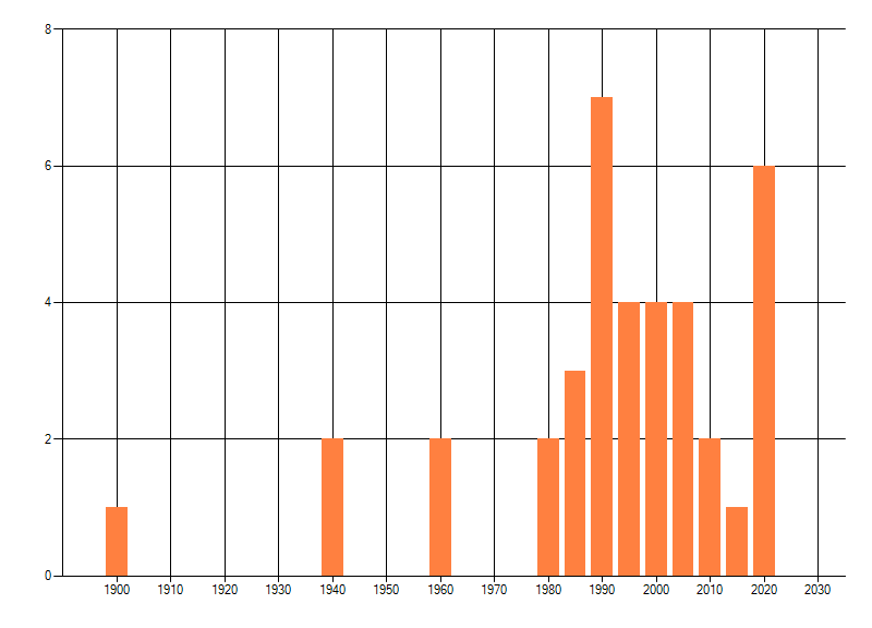 Het aantal atlasblokken (5x5 km) waarin de soort is gemeld binnen een periode van vijf jaar (vanaf 1980) of twintig jaar. Niet gecorrigeerd voor waarnemersinspanning en het aantal doorgegeven waarnemingen kan sterk variëren per periode, dus een trend in verspreiding kan hier niet direct uit worden afgelezen. Het opgegeven jaartal is het eerste jaar van de periode. Bron: gevalideerde waarnemingen uit de NDFF.