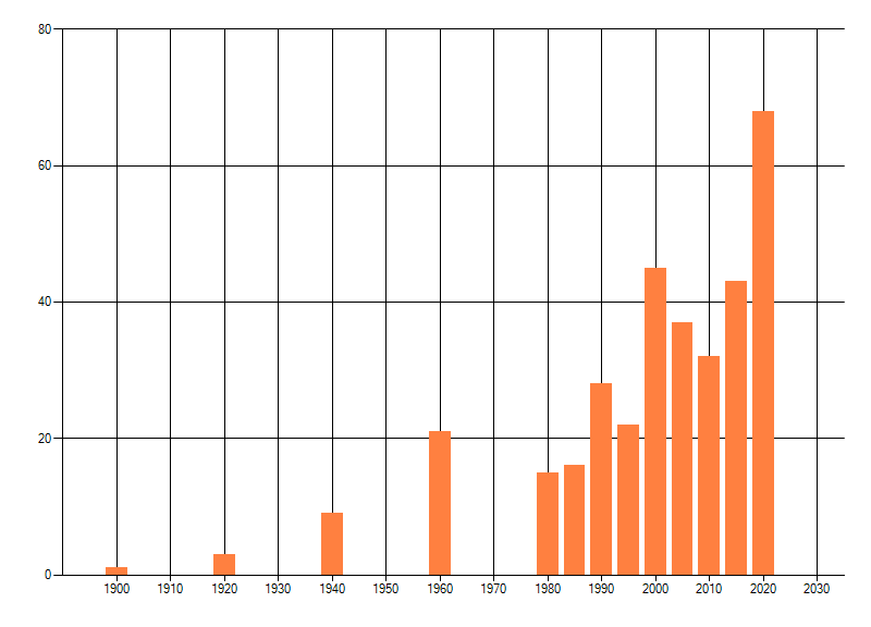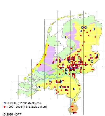 Het aantal atlasblokken (5x5 km) waarin de soort is gemeld binnen een periode van vijf jaar (vanaf 1980) of twintig jaar. Niet gecorrigeerd voor waarnemersinspanning en het aantal doorgegeven waarnemingen kan sterk variëren per periode, dus een trend in verspreiding kan hier niet direct uit worden afgelezen. Het opgegeven jaartal is het eerste jaar van de periode. Bron: gevalideerde waarnemingen uit de NDFF.