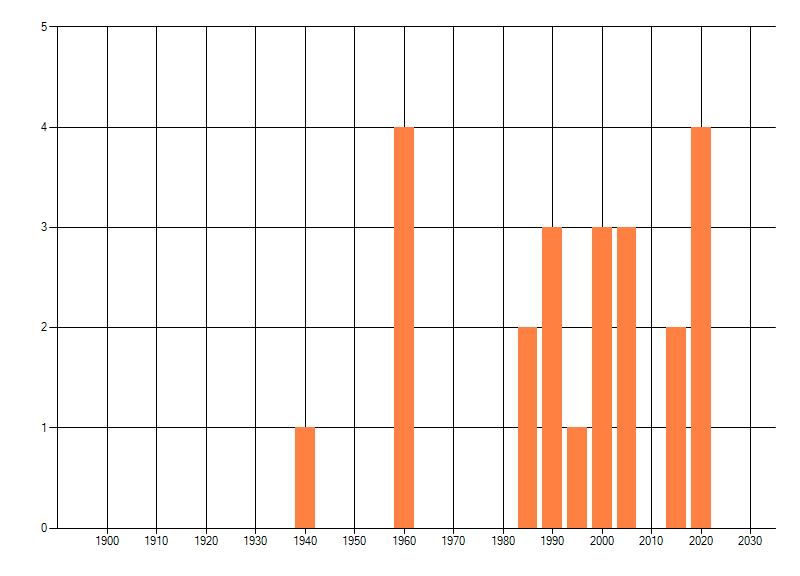 Het aantal atlasblokken (5x5 km) waarin de soort is gemeld binnen een periode van vijf jaar (vanaf 1980) of twintig jaar. Niet gecorrigeerd voor waarnemersinspanning en het aantal doorgegeven waarnemingen kan sterk variëren per periode, dus een trend in verspreiding kan hier niet direct uit worden afgelezen. Het opgegeven jaartal is het eerste jaar van de periode. Bron: gevalideerde waarnemingen uit de NDFF.