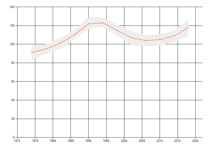 Gemiddelde trend van het aantal kilometerhokken waarin de soort voorkomt, weergegeven als indexcijfer (1975-1978 = 100).