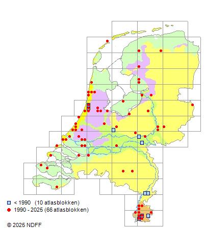 Het aantal atlasblokken (5x5 km) waarin de soort is gemeld binnen een periode van vijf jaar (vanaf 1980) of twintig jaar. Niet gecorrigeerd voor waarnemersinspanning en het aantal doorgegeven waarnemingen kan sterk variëren per periode, dus een trend in verspreiding kan hier niet direct uit worden afgelezen. Het opgegeven jaartal is het eerste jaar van de periode. Bron: gevalideerde waarnemingen uit de NDFF.
