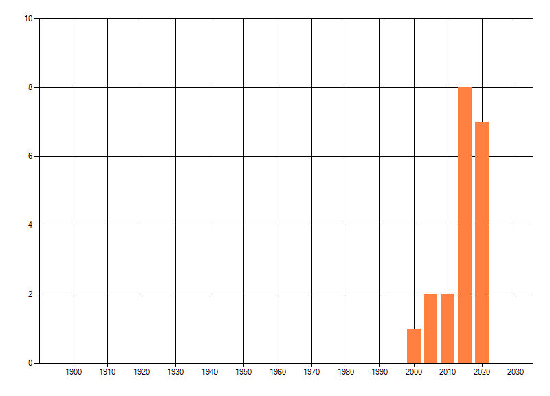 Het aantal atlasblokken (5x5 km) waarin de soort is gemeld binnen een periode van vijf jaar (vanaf 1980) of twintig jaar. Niet gecorrigeerd voor waarnemersinspanning en het aantal doorgegeven waarnemingen kan sterk variëren per periode, dus een trend in verspreiding kan hier niet direct uit worden afgelezen. Het opgegeven jaartal is het eerste jaar van de periode. Bron: gevalideerde waarnemingen uit de NDFF.
