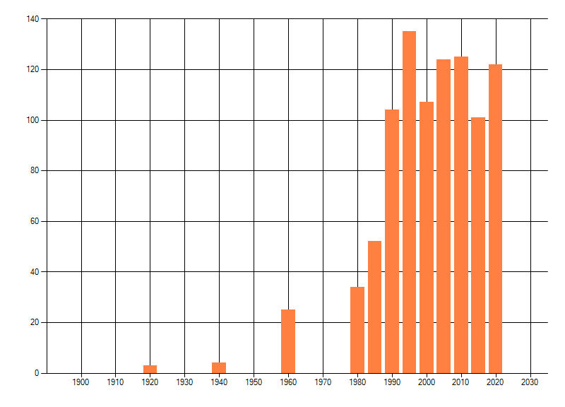 Het aantal atlasblokken (5x5 km) waarin de soort is gemeld binnen een periode van vijf jaar (vanaf 1980) of twintig jaar. Niet gecorrigeerd voor waarnemersinspanning en het aantal doorgegeven waarnemingen kan sterk variëren per periode, dus een trend in verspreiding kan hier niet direct uit worden afgelezen. Het opgegeven jaartal is het eerste jaar van de periode. Bron: gevalideerde waarnemingen uit de NDFF.