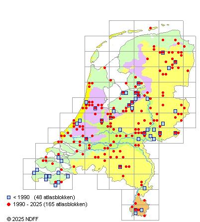Het aantal atlasblokken (5x5 km) waarin de soort is gemeld binnen een periode van vijf jaar (vanaf 1980) of twintig jaar. Niet gecorrigeerd voor waarnemersinspanning en het aantal doorgegeven waarnemingen kan sterk variëren per periode, dus een trend in verspreiding kan hier niet direct uit worden afgelezen. Het opgegeven jaartal is het eerste jaar van de periode. Bron: gevalideerde waarnemingen uit de NDFF.