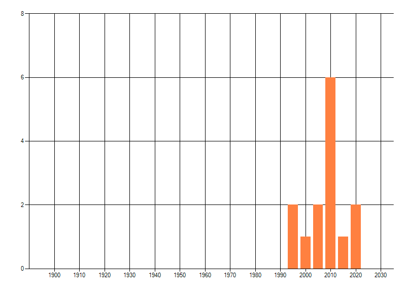 Het aantal atlasblokken (5x5 km) waarin de soort is gemeld binnen een periode van vijf jaar (vanaf 1980) of twintig jaar. Niet gecorrigeerd voor waarnemersinspanning en het aantal doorgegeven waarnemingen kan sterk variëren per periode, dus een trend in verspreiding kan hier niet direct uit worden afgelezen. Het opgegeven jaartal is het eerste jaar van de periode. Bron: gevalideerde waarnemingen uit de NDFF.
