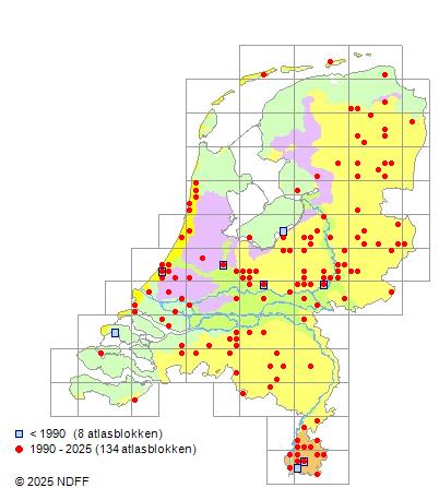 Het aantal atlasblokken (5x5 km) waarin de soort is gemeld binnen een periode van vijf jaar (vanaf 1980) of twintig jaar. Niet gecorrigeerd voor waarnemersinspanning en het aantal doorgegeven waarnemingen kan sterk variëren per periode, dus een trend in verspreiding kan hier niet direct uit worden afgelezen. Het opgegeven jaartal is het eerste jaar van de periode. Bron: gevalideerde waarnemingen uit de NDFF.