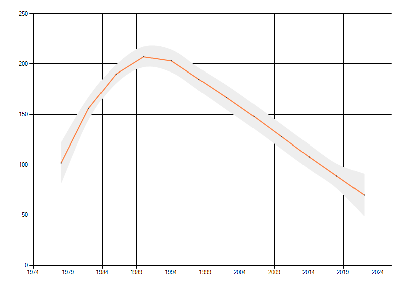 Gemiddelde trend van het aantal kilometerhokken waarin de soort voorkomt, weergegeven als indexcijfer (1975-1978 = 100).