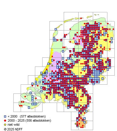 CC BY-NC-SA 3.0 NLVerspreidingNederlandVrij algemeen in het rivierengebied, laagveengebieden, plaatselijk in het oosten en midden en in het noordelijk zeekleigebied, elders zeer zeldzaam. Niet in Zuid-Limburg en op de Waddeneilanden.